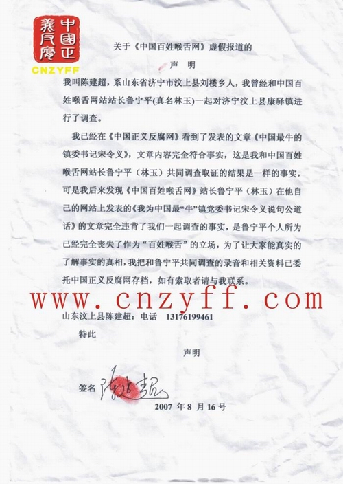 我叫陈建超,系山东省济宁市汶上县刘楼乡人,我曾经和中国百姓喉舌网站站长鲁宁平(真名林玉)一起对济宁汶上县康驿镇进行了调查。