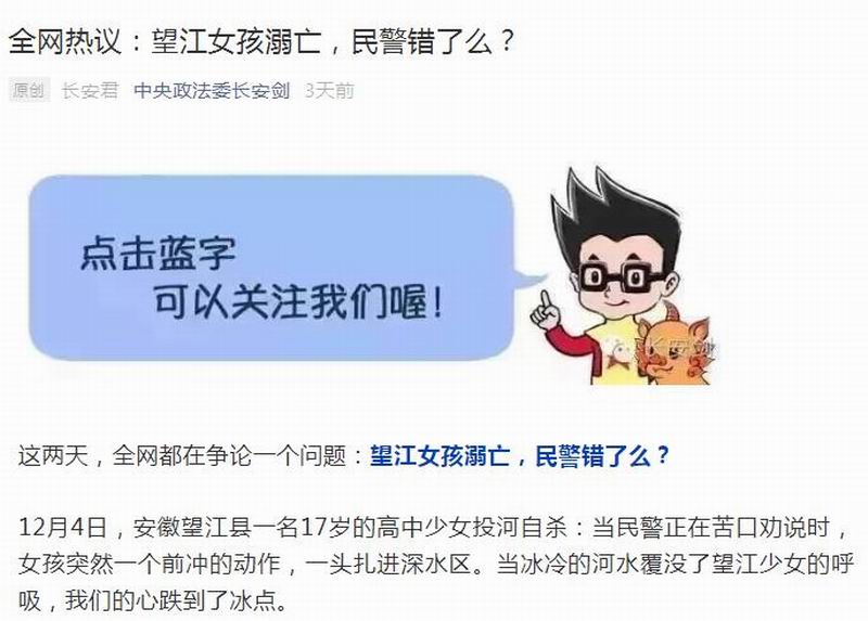 ▲标题为“全网热议:望江女孩溺亡,民警错了么?”图片来源:中共中央政法委员会微信公众号 / 截图